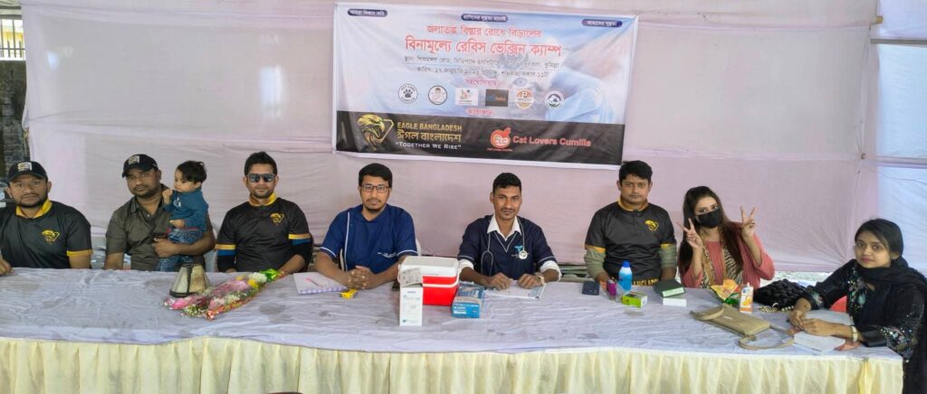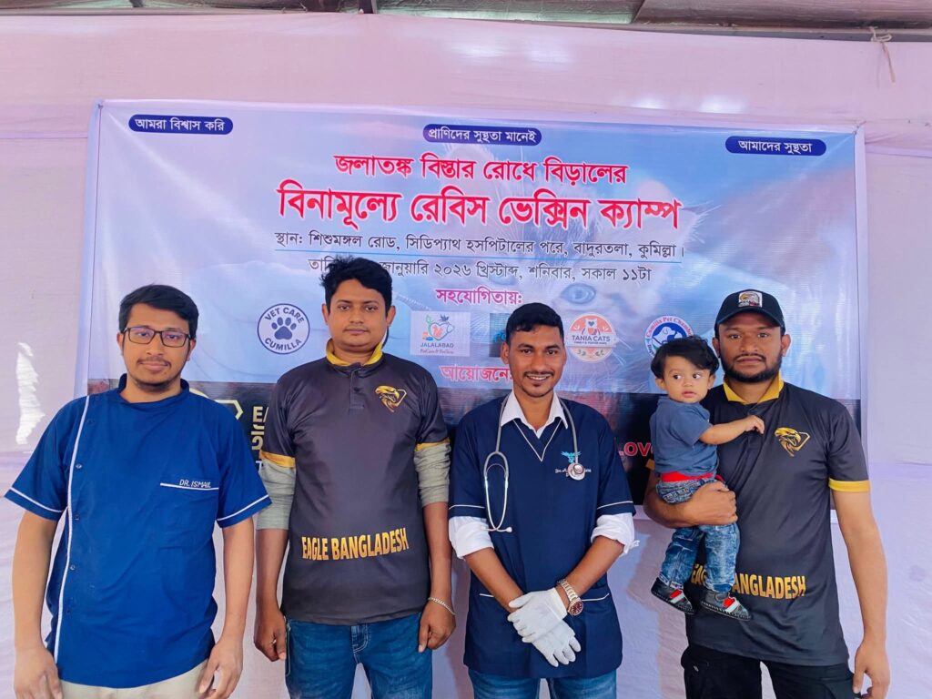 সমাজসেবামূলক সংগঠন Eagle Bangladesh এবং Cat Lovers Cumilla (CLC)–এর যৌথ উদ্যোগে শনিবার নগরীর বাদুরতলা এলাকার সিডি প্যাথ হাসপাতালের গলিতে একটি ফ্রি রেবিস ভ্যাকসিনেশন ক্যাম্প–২০২৬ সফলভাবে অনুষ্ঠিত হয়েছে।